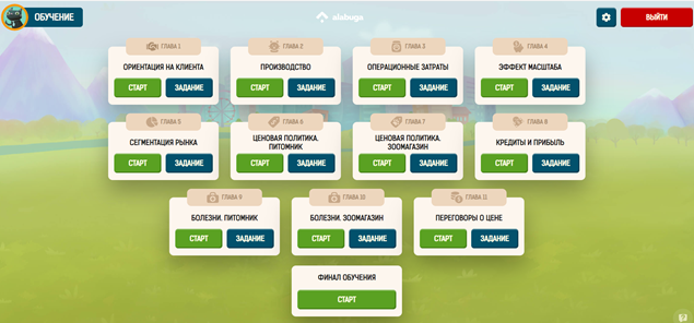 В ОЭЗ «Алабуга» проходит ассессмент сотрудников и студентов, одним из этапов которого является Business Cats. Участники бизнес-симуляции вначале проходят сессии на 24 игрока, а затем командные на 125 игроков и корпоративную версию на 625 игроков. Суть бизнес-симуляции заключается в том, что есть рынок по купле, продаже и выращиванию котов. У игрока может быть одна из двух ролей: питомник (выращивает котов) и зоомагазин (покупает/продает котов в городе и у питомника). Business Cats располагается на HR-платформе ОЭЗ «Алабуга» https://hr.alabuga.ru/, интерфейс которой представлен на рисунке 1.