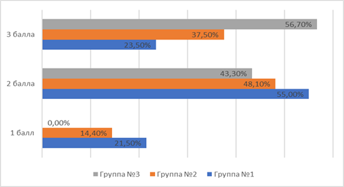 Медианное значение баллов, полученных на демонстрационном экзамене в первой группе, составило 15,5% (0%;85%), во второй – 71% (0%;85%), в третьей – 79% (10%;89,75%). Таким образом, результаты демонстрационного экзамена в первой группе были статистически значимо ниже (p1,2 <0.05; p1,3<0.05; p2,3=0,44).