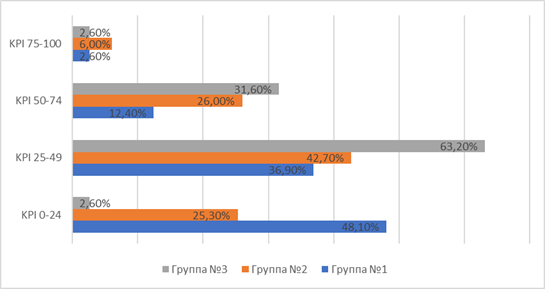 Таким образом, среднее значение KPI было статистически значимо выше в третьей группе (p1,2<0,001; p1,3<0,001; p2,3=0,172).