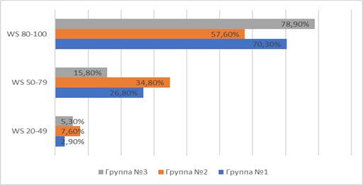 При этом среднее значение коэффициента эффективности в первой группе составило 27% (15%;36%), во второй – 44,5% (36%;57,75%), в третьей – 55% (46%;67,5%). Таким образом, результаты в третьей группе были статистически значимо выше в сравнении с группами 2, 3 и без статистически значимой разницы между группами 2 и 3 (p1,2<0,05 p1,3<0,05; p2,3=0,44).