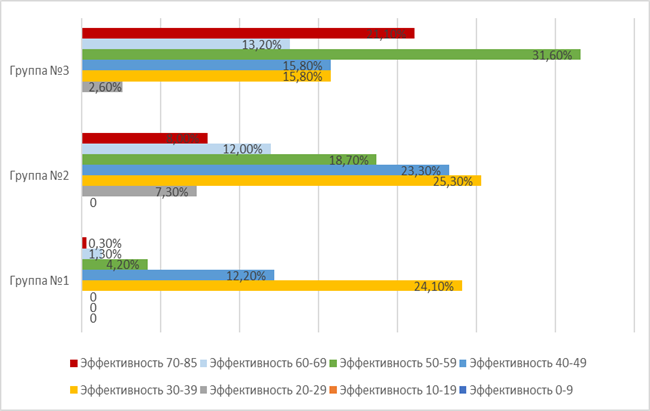 Как представлено на рисунке 5, в первой группе ни один из участников не продемонстрировал высокий уровень эффективности. Наблюдается тенденция увеличения коэффициента эффективности от первой к третьей группе, при этом максимальные значения достигаются именно в третьей группе.