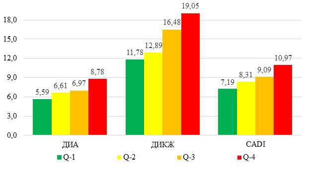 Примечания: ДИА – Дерматологический индекс акне; ДИКЖ – Дерматологический индекс качества жизни; CADI – Кардиффский индекс социальной дезадаптации, ассоциированной с акне; Q – квартиль.