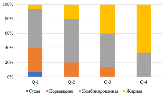 Рис. 2. Типы кожи лица у больных акне в квартилях инсулиноподобного фактора роста-1 (составлено авторами по результатам данного исследования)