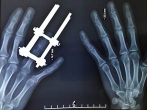 На первом этапе лечения была выполнена первичная хирургическая обработка раны. Затем произведено удаление костных фрагментов и рубцово-изменённых мягких тканей. Для последующего моделирования применялся аппарат внешней фиксации, оснащённый четырьмя осевыми направляющими. Указанное устройство обеспечивает высокую точность дистракции, предотвращает смещение мягкотканных структур и способствует равномерному распределению нагрузки на костную ткань. Для стабилизации костных фрагментов и устранения укорочения пальца был установлен данный аппарат.