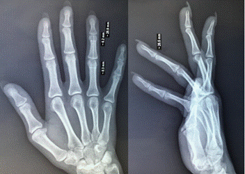 Пациентке была проведена рентгенография правой кисти, которая позволила детально проанализировать размеры средней фаланги четвёртого пальца правой кисти. Это исследование было выполнено для максимально точного подбора параметров имплантата, включая его диаметр и длину, что является важным этапом подготовки к предстоящему медицинскому вмешательству. Полученные данные обеспечили высокую точность и эффективность лечения, минимизировали возможные риски и гарантировали оптимальные результаты для пациентки (рис. 2).