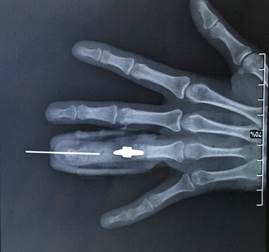 Описание клинического случая. Пациентка в возрасте 19 лет была госпитализирована в Иркутскую областную клиническую больницу в отделение микрохирургии спустя два часа после получения огнестрельного ранения. При поступлении было зафиксировано: на ладонной поверхности кисти обнаружено входное отверстие диаметром до одного сантиметра с рваными краями в области межпальцевого пространства, а также выходное отверстие диаметром до двух сантиметров. Рентгенологическое обследование показало полное разрушение средней фаланги и проксимального межфалангового сустава четвёртого пальца левой кисти, а также укорочение данного пальца (рис. 1).