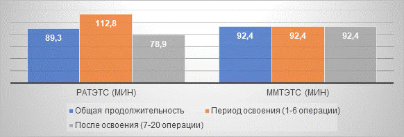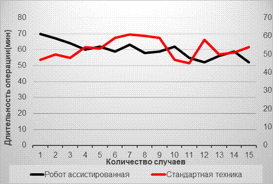Анализ кривой обучаемости 5 хирургов продемонстрировал обнадеживающие результаты освоения роботической технологии. На начальном этапе продолжительность операций с применением робота превышала время мануальных вмешательств на 20-30 минут. Однако к 6-7-й операции временные характеристики сравнялись с показателями ммТЭТС, а в ряде случаев раТЭТС выполнялись быстрее чем ммТЭТС, что отражено на рисунке 4.