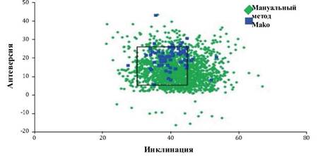 Рис. 3. Сравнение ориентации ацетабулярного компонента с использованием раТЭТС Mako (100 пац.) и ммТЭТС (100 пац.)