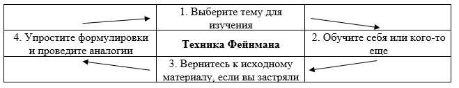 Техника Фейнмана [15; 16, с. 248-272] – эффективный метод осмысления сложных концепций и идей без их заучивания. Названная в честь знаменитого физика Ричарда Фейнмана, эта техника отражает его подход к обучению, основанный на активном, осмысленном и творческом взаимодействии с материалом. Фейнман отвергал механическое запоминание, считая, что настоящее понимание приходит через активный процесс «проб и ошибок, открытий и свободного поиска» [15; 16, с. 248-272]. Если не удаётся объяснить тему просто и ясно, значит, понимание недостаточно глубокое, считал Фейнман.