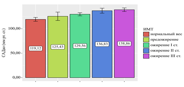 Анализ полученных результатов выявил статистически значимые различия в показателях САД у подростков с ожирением (рис. 1). В частности, у подростков, страдающих ожирением I ст., уровень САД был выше на 10 %, у подростков с ожирением II степени – на 14,7 %, а у подростков с ожирением III ст. – на 16,5 % в сравнении с группой подростков, имеющих нормальный ИМТ (р < 0,05). У подростков с предожирением САД было в пределах нормальных значений.