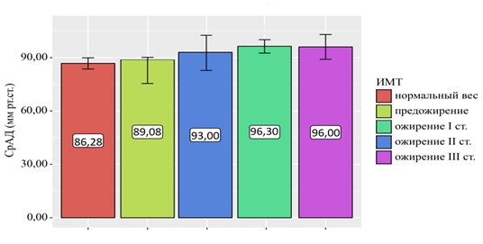 Как видно из рис. 2, СрАД имело тенденцию к повышению у подростков с предожирением и ожирением 1 ст. (на 7,5 %), а у подростков с ожирением 2 и 3 ст. этот показатель был выше на 10,4 % (р < 0,05) по сравнению с контрольной группой.