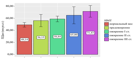 Рис. 3. Медиана пульсового давления (мм рт. ст.) в зависимости от ИМТ