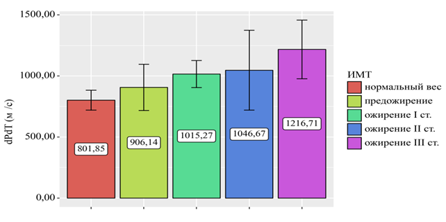 Рис. 4. Показатели скорости нарастания давления в аорте (м/с) в зависимости от ИМТ