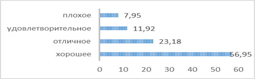 При самооценке здоровья 56,95% студентов определили его как «хорошее», 23,18% – «отличное», 11,92% – «удовлетворительное» и 7,95% – «плохое». Полученные ответы свидетельствуют о высокой самооценке состояния своего здоровья среди опрошенных (рис.1).