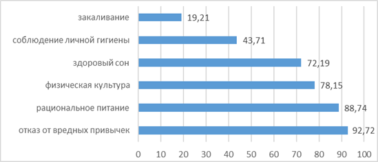 Компоненты ЗОЖ как динамической системы адаптационного поведения студенческой молодежи важны в условиях изменения среды. Среди основных компонентов здорового образа жизни респондентами были выделены: 1)отказ от вредных привычек (92,72%), 2) рациональное питание (88,74%), 3) физическая культура (78,15%), 4) здоровый сон (72,19%), 5) соблюдение личной гигиены (43,71%), 6) закаливание (19,21%) (рис. 3). Полученные ответы позволяют сделать вывод, что студенты в целом имеют сформированные представления о ключевых компонентах, составляющих понятие «здоровый образ жизни».