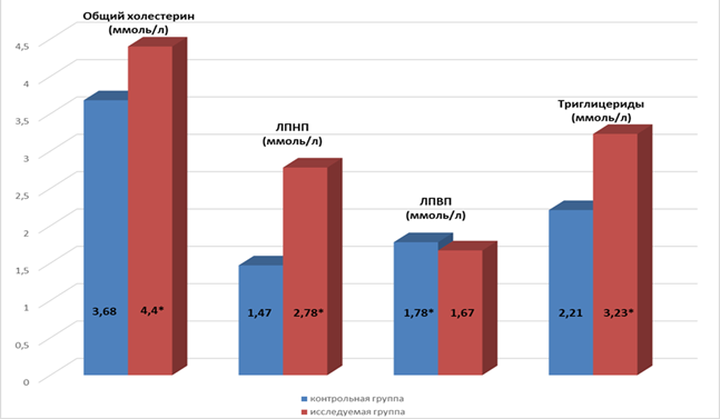 Рис. 2. Сравнение липидного профиля в контрольной и исследуемой группах; * p < 0,05.