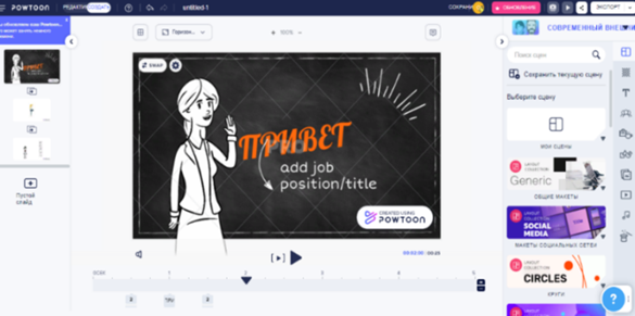 Разработка анимированных презентаций осуществлялась на платформе PowToon. Сервис интересен тем, что появляется возможность создания небольшого мультипликационного видео, раскрывающего определенную проблему или обучающий материал в эффектной форме (рис. 1). Функционал данного цифрового продукта позволяет настроить действия героев по своему сценарию, управляя шкалой времени, задавая последовательность происходящих событий, определенные эффекты с панели инструментов и др.