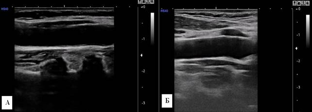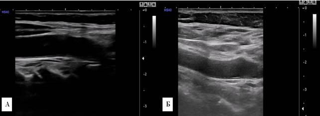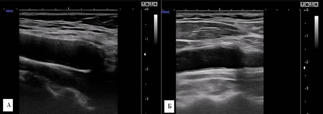 Рис. 1. Сонограмма a. carotis communis dextra. А – мужчина, 30 лет; Б – женщина, 29 лет. У мужчины диаметр артерии больше.