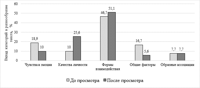 Из рисунка видно, что наибольшие различия до и после просмотра фильма были выявлены в категории «Качества личности»: показатель вырос в 2,5 раза (10 – до просмотра, 25,6 – после). Отмечается значительное снижение значения после просмотра в категориях «Общие факторы» (с 16,7 до 5,6) и «Чувства и эмоции» (с 18,9 до 10). В категории «Образные ассоциации» различия показателей не выявлено.