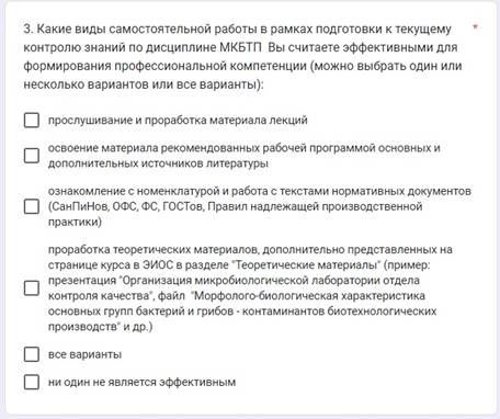Рис. 1. Пример вопроса закрытого вида со множественным выбором в анкете для определения отношения студентов к СР по дисциплине МКБТП с вариантами ответов