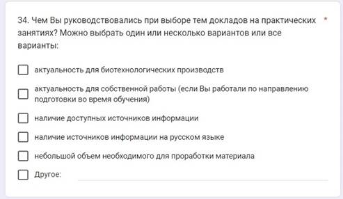 Студентам предлагалось самостоятельно выбрать одну тему для подготовки доклада из предложенных 30 тем. За рассматриваемый период каждая тема хотя бы раз была выбрана, что указывает на их актуальность. Следует отметить, что при составлении формулировок тем на основании анализа ПС акцент делался на то, чтобы содержательная часть СР над докладом позволяла получить требуемые ПС знания и умения. Например, для дискуссии по теме «Микробиологический мониторинг в биотехнологическом производстве» предлагаются темы «Методы микробиологического мониторинга производственной среды» и «Цели и программа микробиологического мониторинга в производстве нестерильных лекарственных средств». Проработка материала для подготовки доклада по этим темам позволяет сформировать предусмотренные ПС знания требований правил надлежащей производственной практики, нормативных правовых актов и стандартов в области системы качества лекарственных средств, регламентирующей документации фармацевтической системы качества производства лекарственных средств, методов поиска причин несоответствий установленным требованиям при производстве лекарственных средств, требований санитарного режима, умения производить анализ состояния фармацевтической системы качества на фармацевтическом производстве, производить анализ причин отклонений и несоответствий, анализ рисков для качества готовой продукции, разрабатывать предложения по улучшению деятельности по качеству, составлять планы работ и осуществлять их контроль [6]. На консультациях по подготовке докладов и в ответах на вопрос анкеты все респонденты в качестве основного аргумента при выборе конкретной темы отметили ее актуальность для биотехнологических производств, более 50% также указали на актуальность для их собственной трудовой деятельности (если они работали на фармацевтических предприятиях во время обучения), причем 5 студентов в свои доклады включили ситуации из личного опыта работы.