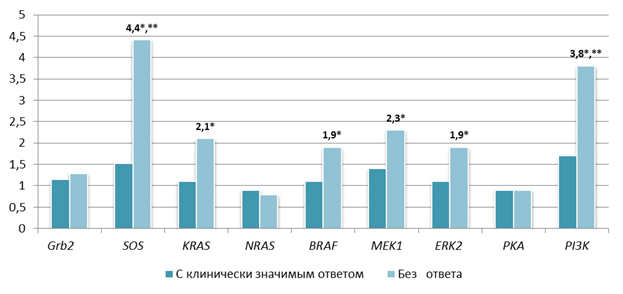 У 317 пациентов ФГБУ «НМИЦ онкологии» МЗ РФ выявлены мутации: V600E у 294, V600К – у 20, V600R – у 1, K601E - у 2 пациентов, и только у 230 из них был зафиксирован клинически значимый ответ на лечение BRAF/MEK-ингибиторами. Биологические образцы всех пациентов были проанализированы на изменение копийности генов BRAF, Grb2, KRAS, NRAS, SOS, MEK1, ERK2, PKA и PI3K. У 87 пациентов с мутацией V600E без ответа на терапию выявлено статистически значимое (p<0,001) увеличение копийности генов SOS в 4,4 раза, KRAS в 2,1 раза, BRAF в 1,9 раза, MEK1 в 2,3 раза, ERK2 в 1,9 раза и PI3K в 3,8 раза относительно доброкачественных новообразований (рис.). А также обнаружено статистически значимое (p<0,001) увеличение копийности генов SOS в 2,9 раза и PI3K в 2,2 раза у пациентов без ответа на терапию относительно группы с клинически значимым ответом.