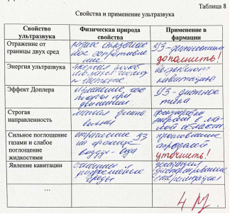 Рис. 2. Пример выполнения студентами-первокурсниками задания ВСР на раскрытие основных характеристик ультразвука и его применения в фармации