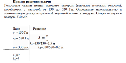 Например: «Задача 2. Известно, что человеческое ухо воспринимает упругие волны в интервале частот от 20 Гц до 20 кГц. Каким длинам волн соответствует этот интервал в воздухе? В воде? Скорости звука в воздухе 340 м/с, в воде 1400 м/с. Решите задачу и ответьте на вопрос: Как эти знания могут быть использованы в деятельности провизора?» [15, с. 14].