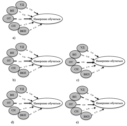 Результаты многогруппового анализа: (a) все студенты; (b) мужчины; (c) женщины; (d) студенты бакалавриата; (e) студенты магистратуры