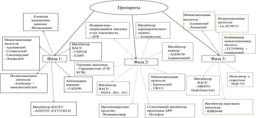 Большинство подходов к терапии БА базируется на ингибировании продукции неправильно сворачивающихся белков, их агрегации и распространения, чтобы снизить уровень токсичности Aβ и тау-белка. На рис. 1 представлены препараты для лечения БА, специфичные к Aβ и находящиеся на разных стадиях клинических испытаний [2].