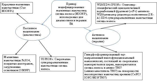 Рис. 3. Пример модифицированных магнитных наночастиц оксида железа, используемых для диагностики и терапии БА [37]