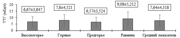 Распределение ТТГ по высотным зонам характеризуется выраженной асимметрией: в равнинных районах фиксируются максимальные средние значения с наибольшим разбросом данных, что отражает высокую вариабельность йодного статуса. Горная зона демонстрирует сочетание повышенного среднего уровня гормона со значительным разбросом. Предгорные территории выделяются минимальными средними величинами и наименьшей вариабельностью, указывая на относительную однородность популяции. Для высокогорья типичны умеренные колебания значений при выраженном йододефиците. Интегральный показатель по территории маскирует региональные диспропорции, подчеркивая необходимость зонально-ориентированных профилактических стратегий (рисунок).