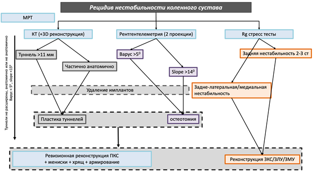 Критериями, не позволяющими выполнить одноэтапную ревизионную стабилизацию коленного сустава, установлены: расширенные более 11 мм в диаметре внутрисуставные апертуры, их не анатомичное расположение, образование критичных дефектов костной ткани на протяжении туннелей, а также характерные деформации проксимального метаэпифиза большеберцовой кости (изменение анатомического бедренно-большеберцового угла более 50 в варусную позицию по сравнению с контрлатеральной конечностью, наклон плато большеберцовой кости кзади более 140).