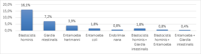 Из 2231 обследованных у 697 (31,2%) при использовании КГМ были обнаружены представители кишечной паразитофауны: Blastocystis spp. (Bl) в 16,1%, Giardia intestinalis (G) в 7,2%, Entamoeba (Е) в 6,5%. Наиболее частыми представителями непатогенных амеб были E. hartmanni - 3,9%, E. coli - 1,8%, Endolimax nana (карликовая амеба) - 0,8%. Выявлены 2-компонентные микст-инвазии, они регистрировались нечасто и составили 3,0%: Bl + G - 1,8%, Bl + E - 0,8%, G + E - 0,4%. Гельминты при проведении обследования, как с использованием КГМ, так и рутинной технологии Parasep, не обнаруживались. При исследовании на липкую ленту яйца Enterobius vermicularis обнаружены у 15 человек (0,67%): в 4 случаях это были взрослые, в 6 случаях - дети дошкольного возраста, в 5 случаях - дети школьного возраста.