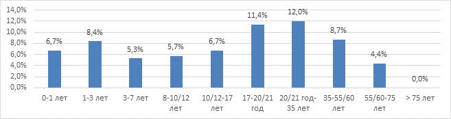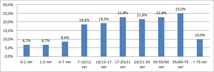 Рис. 3. Частота встречаемости Blastocystis spp. у жителей крупных индустриальных центров в разные возрастные периоды