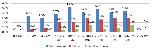 Выявляемость E. hartmanni нарастала в подростковом возрасте (рис. 5) и в дальнейшем сохранялась на том же уровне. Цисты E. coli обнаруживались у 1,8%, нарастание распространенности E. coli отмечалось в младшем школьном и юношеском возрастах. Нарастание распространенности цист карликовой амебы регистрировалось в подростковом и зрелом возрасте. Следует также отметить, что ни у одного из обследованных не были обнаружены цисты и/или трофозоиты дизентерийной амебы (E. histolytica), а также их морфологические аналоги (E. dispar и E. moshkovski), что находит подтверждение в уровне заболеваемости амебиазом, который на протяжении нескольких лет отсутствует в официальной статистике.