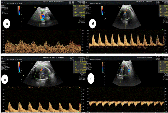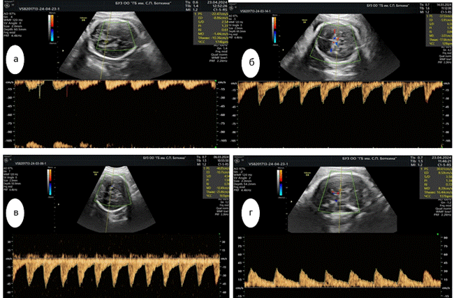 Рис. 2. Доплерометрические показатели церебрального кровотока в ЗМА: а) основная группа, тяжелая ПЭ; б) основная группа, умеренная ПЭ; в) группа сравнения; г) контрольная группа