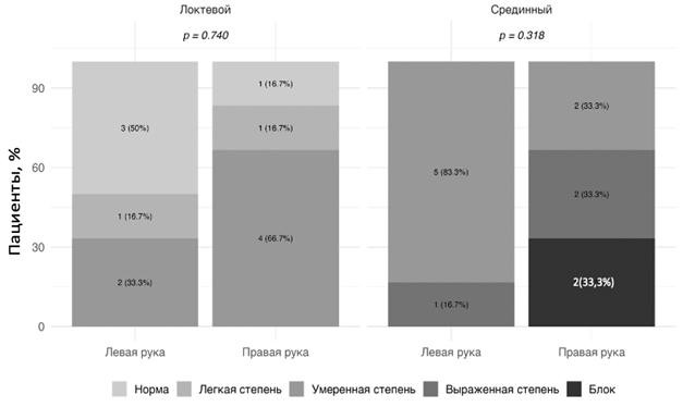 Левые срединные нервы, амплитуда М-ответа: у 1 (16,7%) пациента выраженное снижение на 70%, у 5 (83,3%) пациентов умеренное снижение на 50–60%. Правые срединные нервы, амплитуда М-ответа: у 2 (33,3%) пациентов выраженное снижение на 80%, у 2 (33,3%) пациентов умеренное снижение на 60%, у 2 (33,3%) пациентов блок проведения. Разница между левой и правой рукой статистически незначима: Р=0,318.