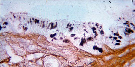 Рис. 7. Серотонинсодержащие апудоциты в СОГ. Иммуногистохимическая реакция, х600