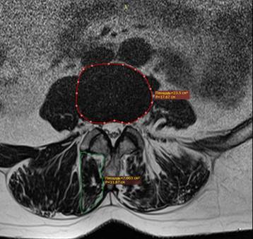 Рис. 1. Измерение relative cross-sectional area m. multifidus пациентки Р. 61 года