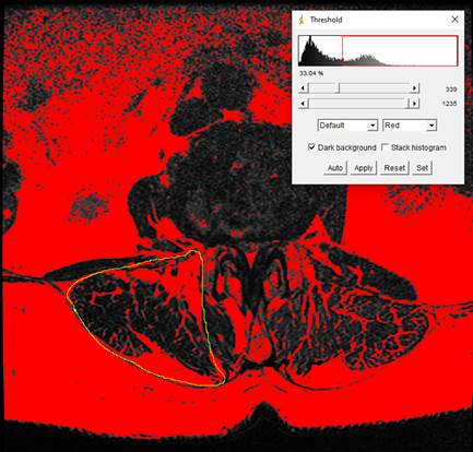 Рис. 2. Измерение жировой инфильтрации m. erector spinae с использованием thresholding technique на программном обеспечении ImageJ у пациентки К. 73 лет