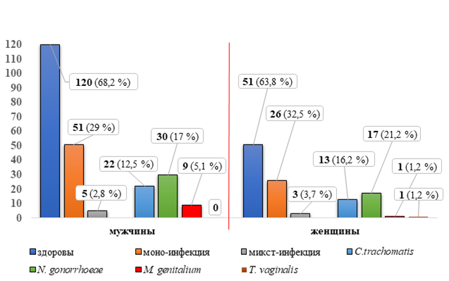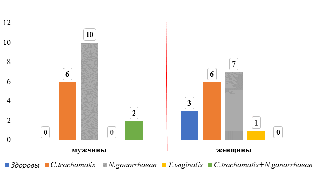 Детальный анализ результатов лабораторных исследований показал, что C. trachomatis была выявлена в 35 случаях (у 22 мужчин и 13 женщин), M. genitalium – в 10 случаях (у 9 мужчин и 1 женщины), N. gonorrhoeae – в 47 случаях, (у 30 мужчин и 17 женщин), T. vaginalis выявлена у 1 женщины (рис. 1).