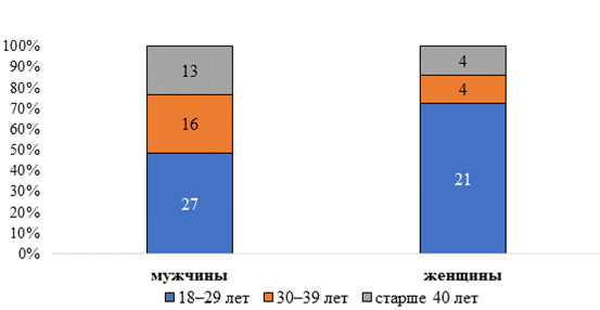 ИППП чаще всего выявлялись у пациентов в возрасте 18–29 лет: у 27 (48,2 %) из56мужчиниу21(72%)из29женщин (рис. 2), что согласуется с мировыми тенденциями [21].