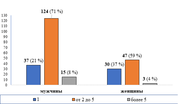 Количество половых партнеров от двух до пяти имели 171 (66,8 %) из 256 пациентов, в том числе 124 (71 %) из 176 мужчин и 47 (59 %) из 80 женщин; более пяти половых партнеров имели 18 (7 %) из 256 пациентов, в том числе 15 (8 %) из 176 мужчин и 3 (4 %) из 80 женщин (рис. 3).
