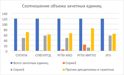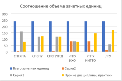 Анализ материалов демонстрирует наиболее гармоничное распределение объема зачетных единиц при подготовке педагогов-дизайнеров в институте художественного образования РГПУ им. А.И. Герцена.