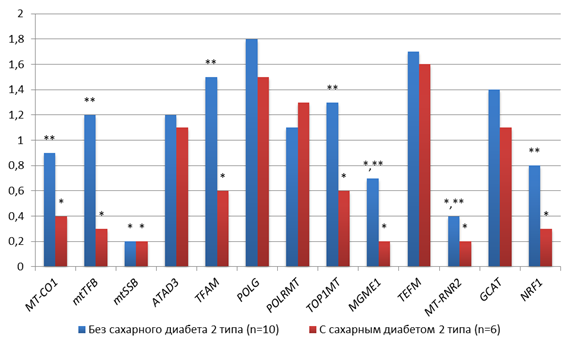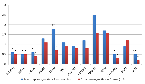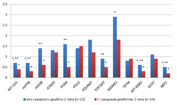 Целью данного исследования явился анализ относительной копийности генов, регулирующих функционирование митохондрий, у больных РТМ с СД2 и без него.