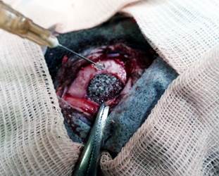 Рис. 1. Положение имплантата в трепанационном окне. Орошение имплантата ОТП