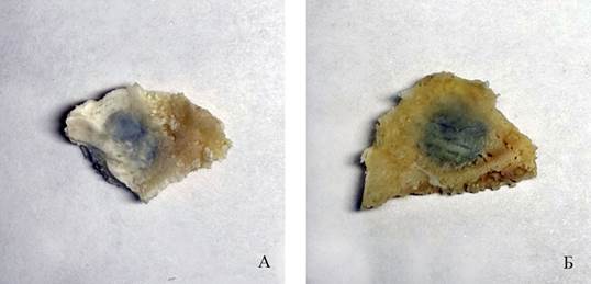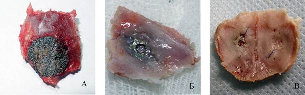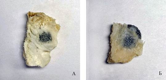 Рис. 4. Фрагменты костей крыши черепа кроликов (А, Б) с имплантатами, дефект черепа полностью не закрылся. Группа животных №2, 40-е сутки эксперимента