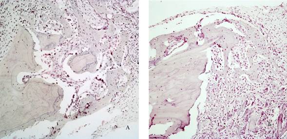 Рис 5. Гистологическая картина на 7 сутки эксперимента: появление эозинофильных островков формирующейся костной ткани (А – 1 группа, Б – 2 группа). Окраска гематоксилином и эозином. Увеличение *100