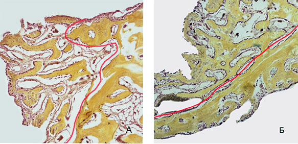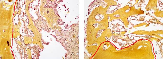 Рис. 6. Зона регенерации на 14 сутки эксперимента: выявлена большая толщина и площадь формирующихся костных трабекул при использовании ОТП. Красным маркером показана граница между формирующейся костной тканью и зрелой костью: А) 2 группа, Б) 1 группа. Окраска по Шморлю. Увеличение *40